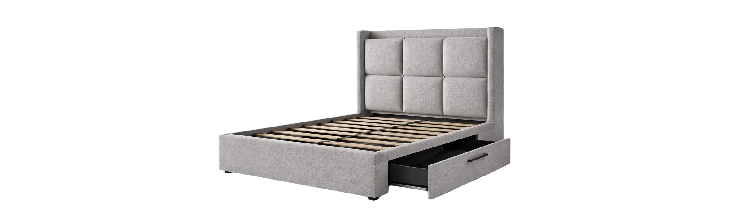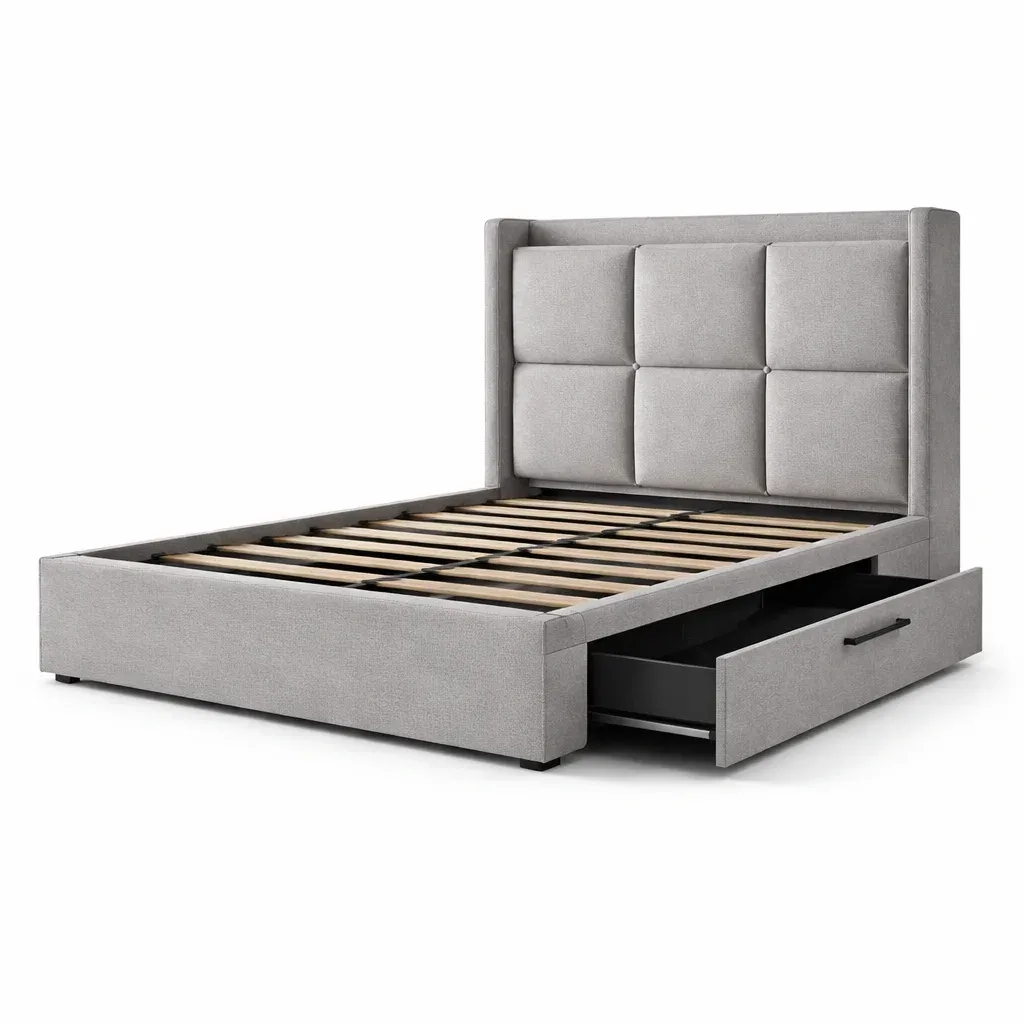 Letto contenitore matrimoniale imbottito grigio con cassetti e testiera trapuntata in legno e tessuto