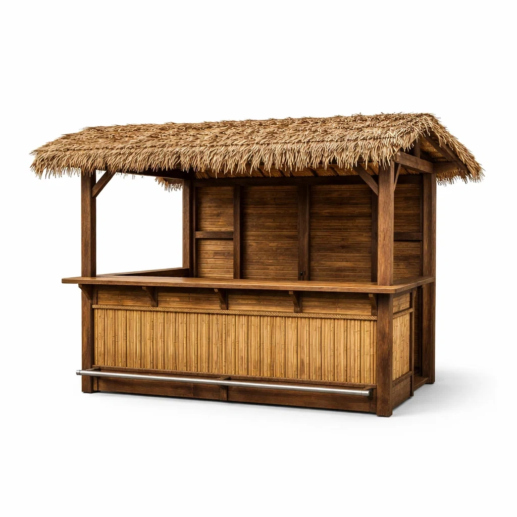 Padiglione bar in legno e bamb羅 per esterni con tetto in paglia