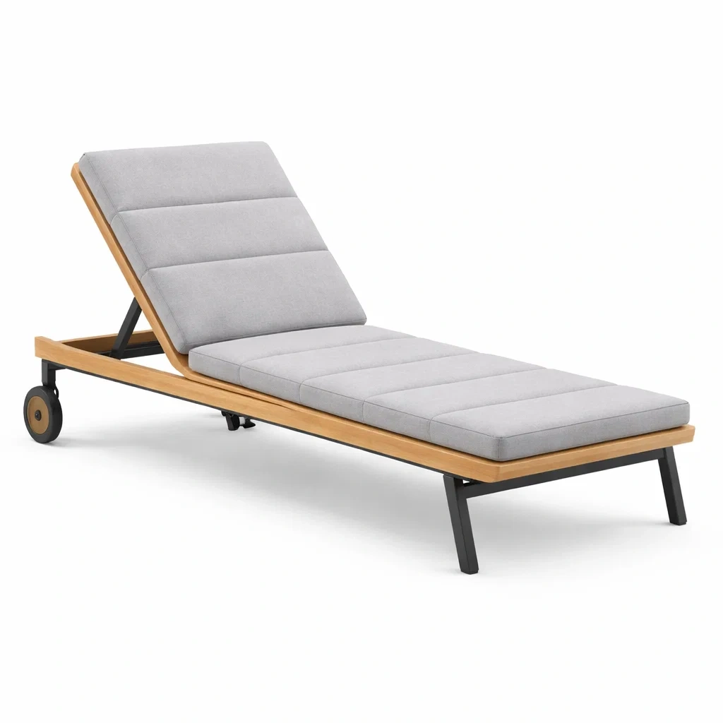 Sdraio in legno massello di teak e alluminio con rivestimento in tessuto grigio