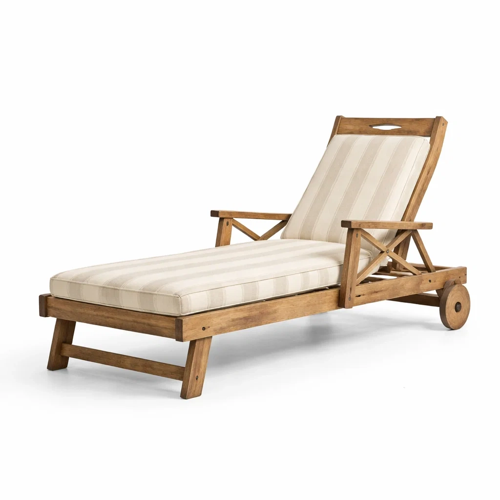 Sdraio in legno di teak con cuscino in tessuto crema