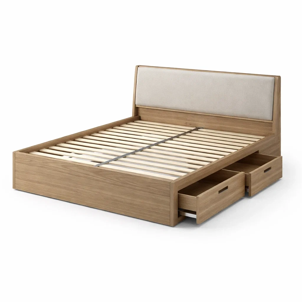 Letto contenitore matrimoniale in legno di rovere con testiera imbottita e cassetti